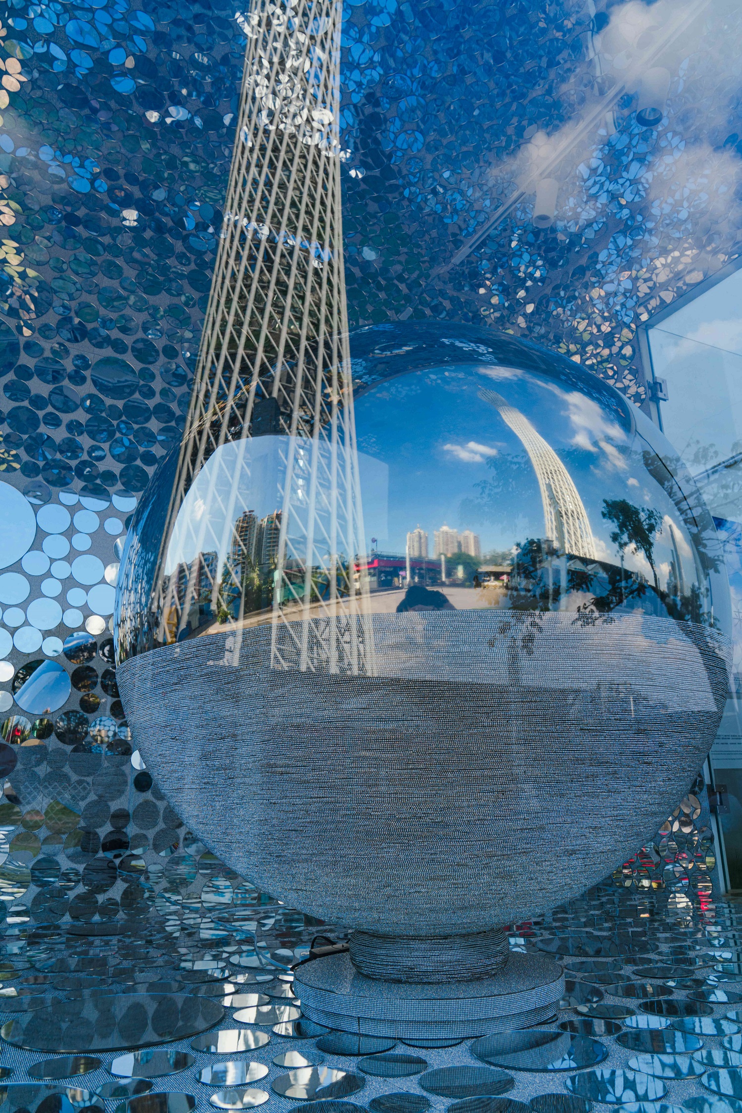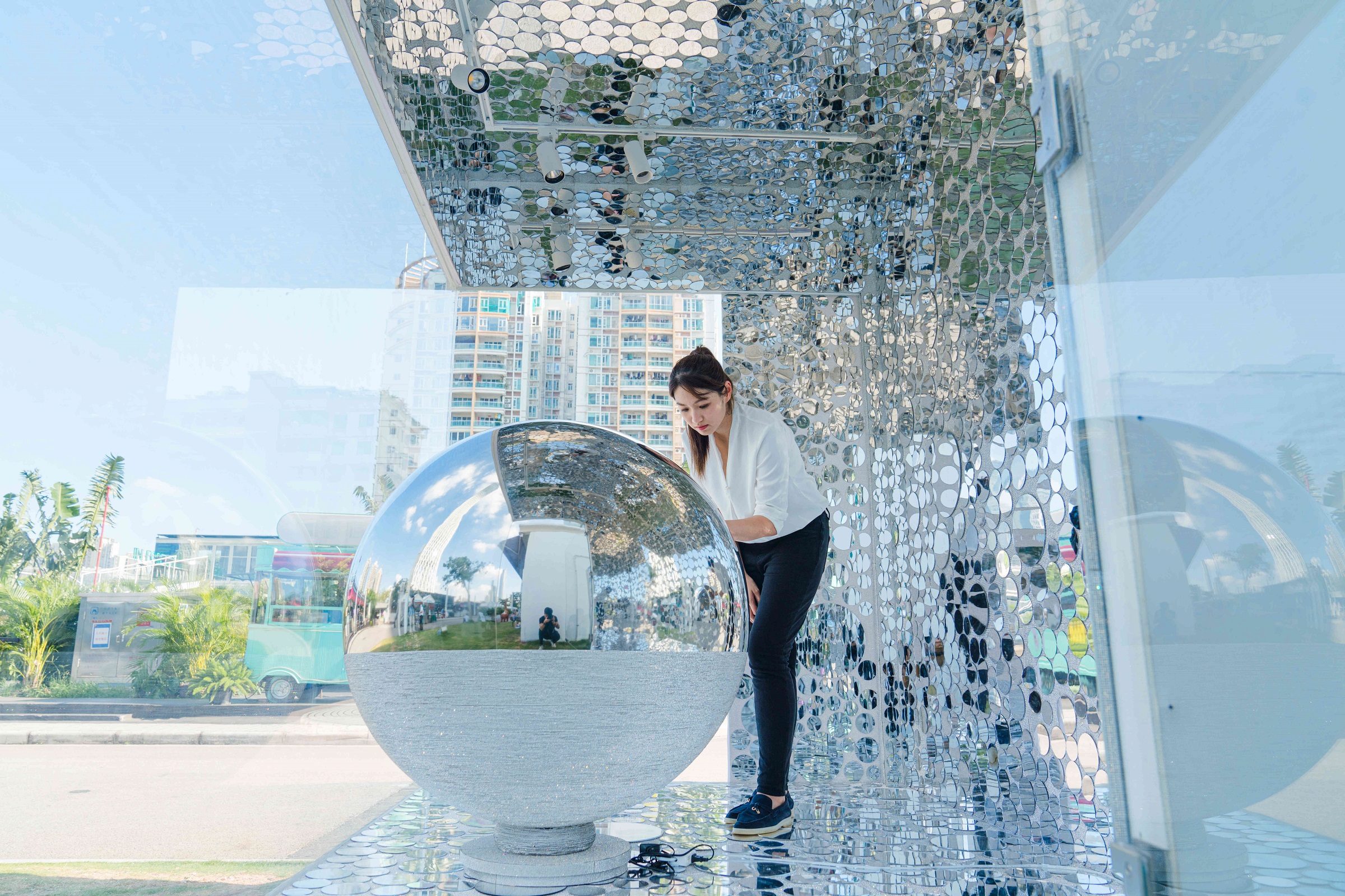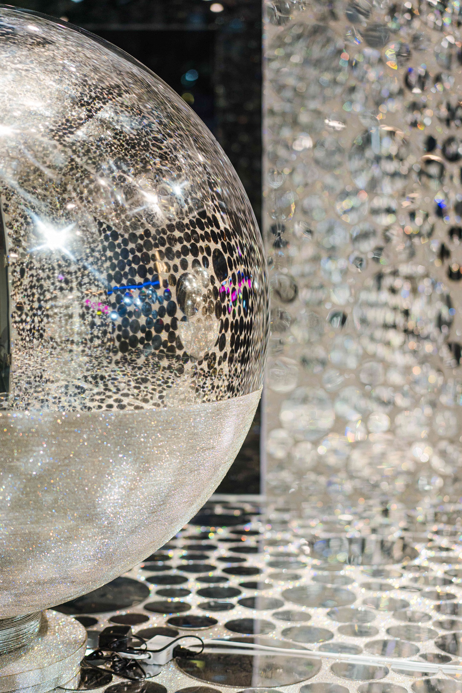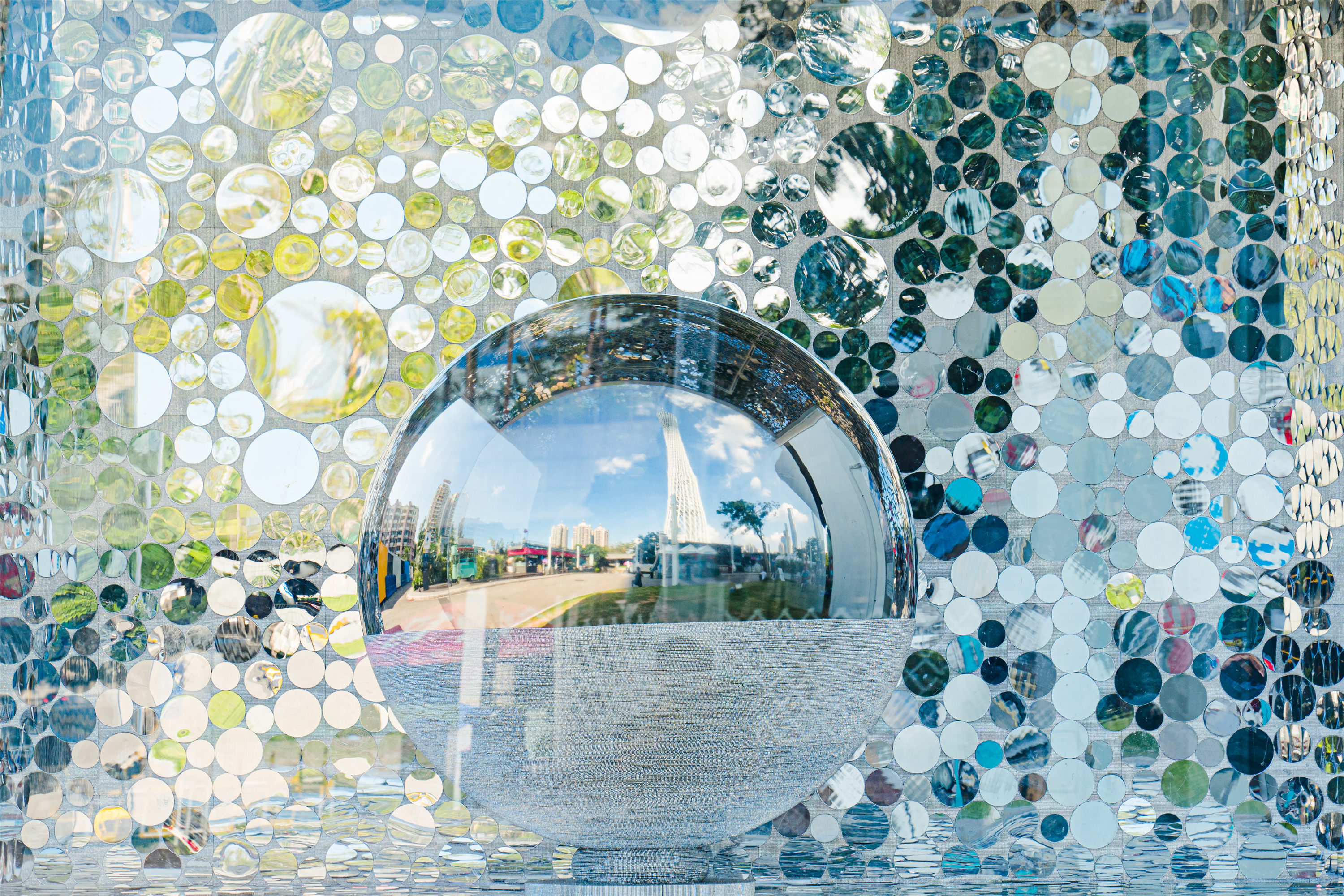 艺术家用带有水钻的钢铁球体以及无数大小不一的圆形镜面为我们创造了一个,看似不现实,而又真实存在,却无法触及的空间。球体和镜面使玻璃洒进的阳光再一次反射,让空间外的真实景象与空间内的虚幻闪耀,魔法般融合,呈现出虚幻的模样。让观众与作品和这座城市之间同时产生互动,而看到的却只是虚幻的影像。