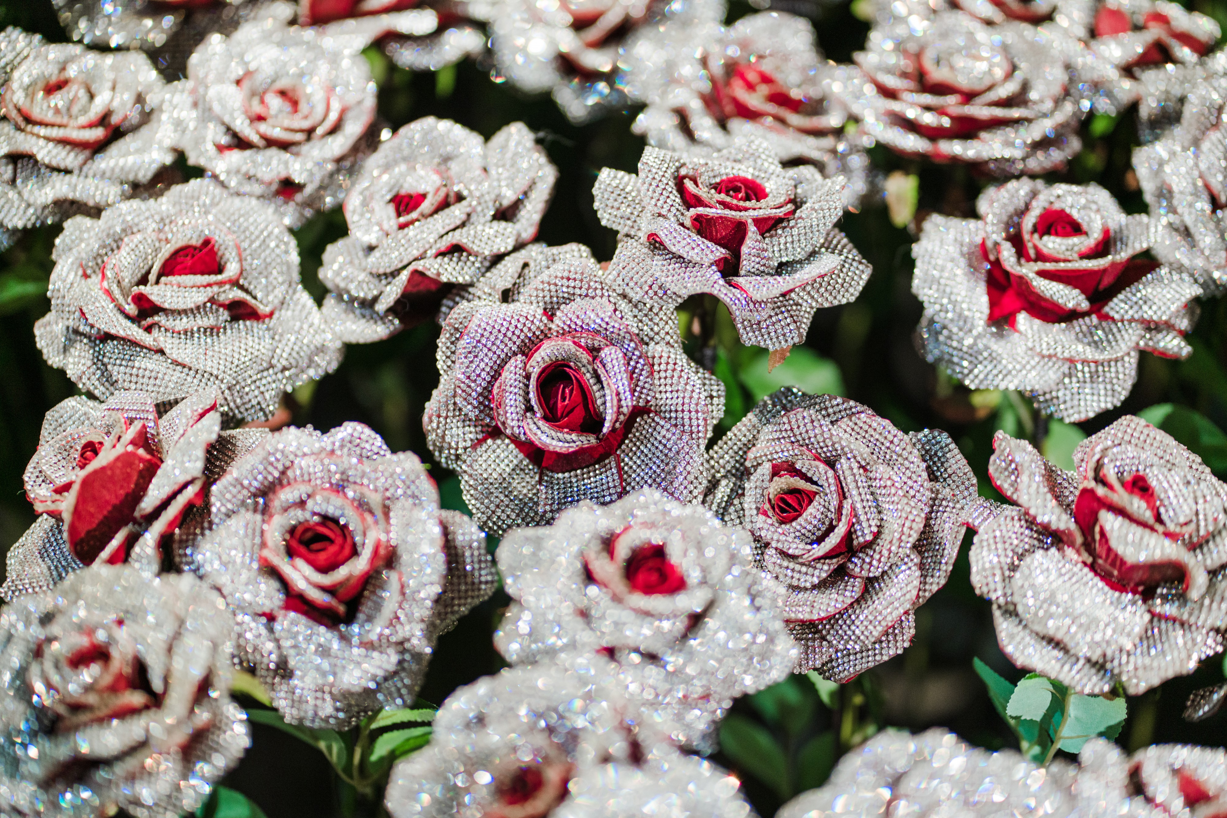 在作品《钻石玫瑰》中,艺术家用水钻覆盖的玫瑰安插在不同的环境当中,从观众对其的观感互动一并完成这装置性的艺术探讨。钻石来源于自然,